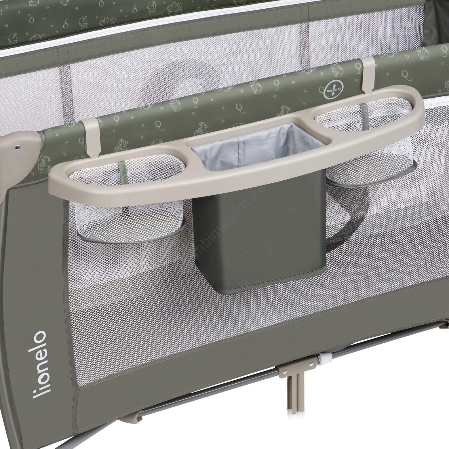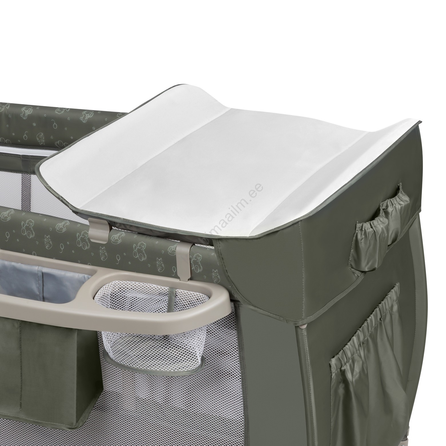 • Komplekt sisaldab: mähkimislauda küljetaskutega (mähkmete, puudri jms jaoks), tarvikukorvi kahe lahtriga, suurt sääsevõrku, varikatust ja mänguvarda pehmete mänguasjadega.