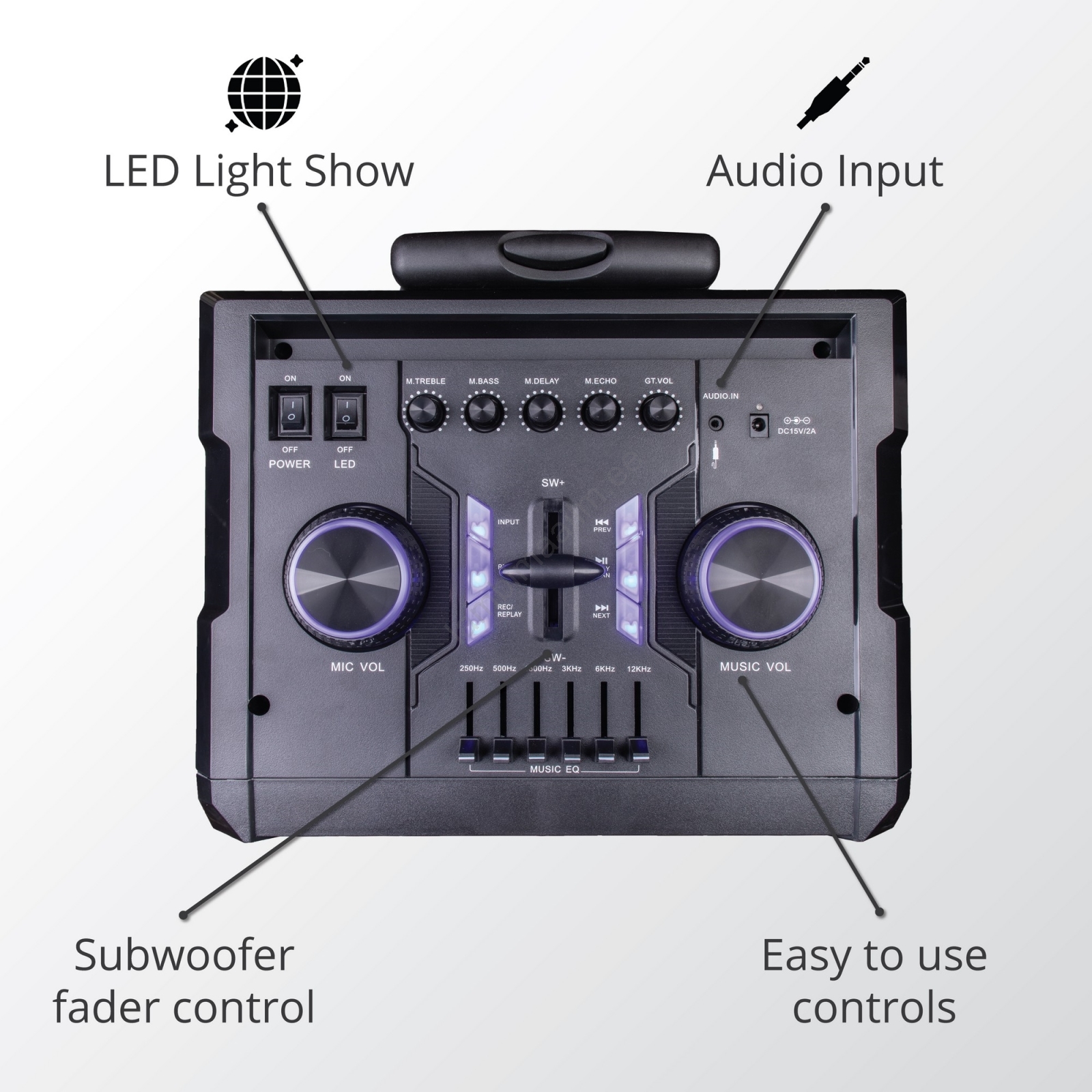• Kõlaril on LED/VFD-ekraan ja LED-valgusefektid.