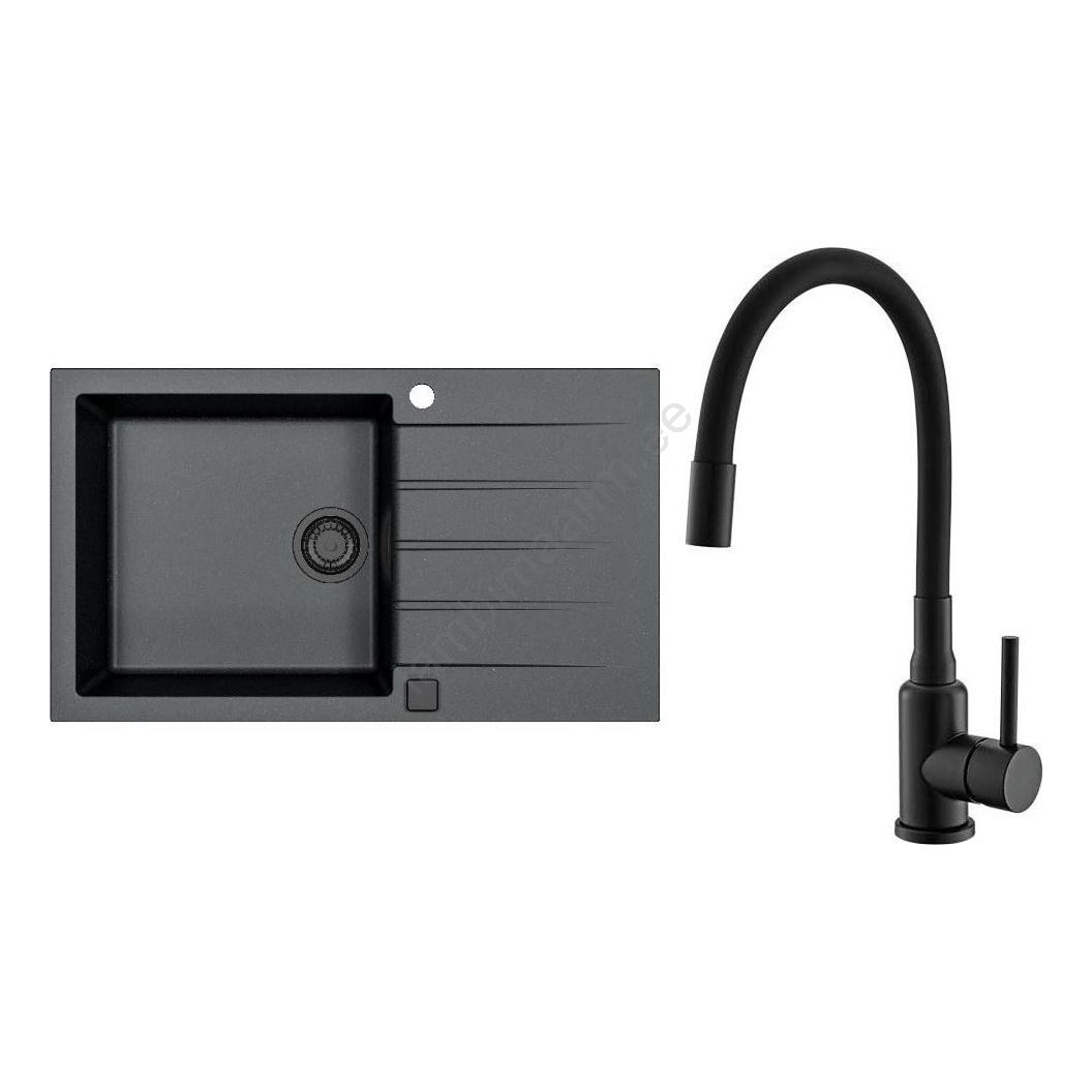 • ALVEUS SETA23201 - köögivalamu ROCK 78x48 cm + MINTAS 34 cm painduva kaelaga valamusegisti, graniit/matt must