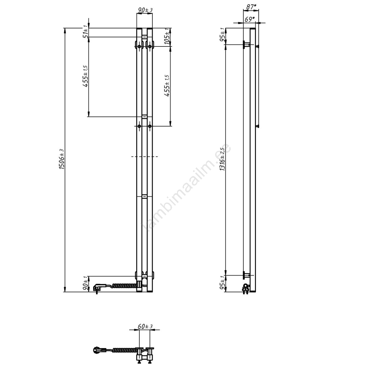 Elektriline rätikukuivati termostaadiga SILOUETTE 106W 150x9 cm must parempoolne