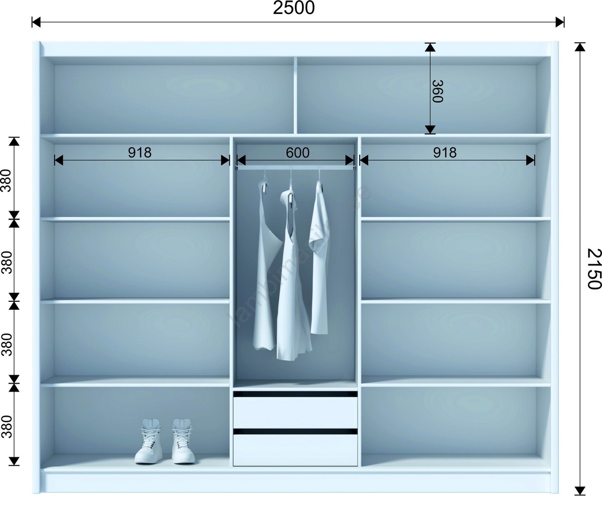 • Kapis on 8 avatud riiulit, 2 sahtlit, riidepuu ja 2 ülemist riiulit kottide ja hooajaliste esemete hoiustamiseks.