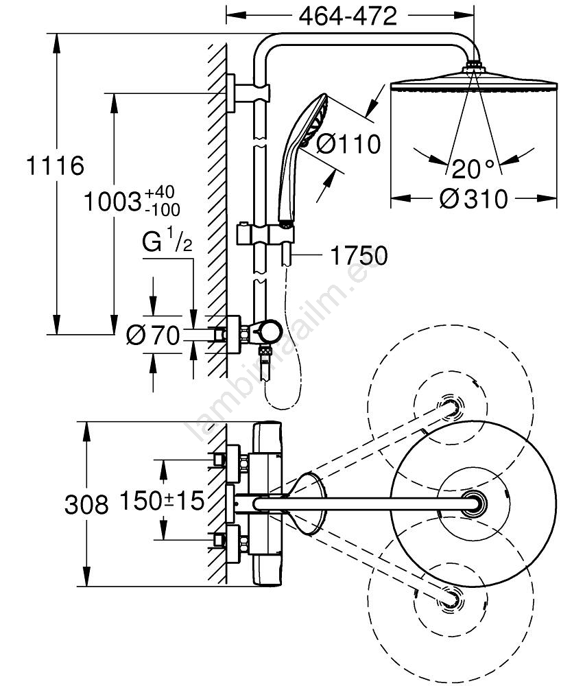 • Horisontaalne pööratav dušivars pikkusega 450 mm peaduši paindlikuks seadistamiseks.