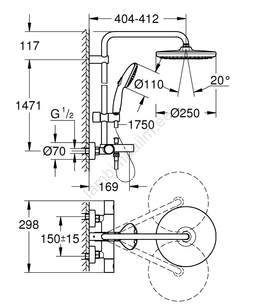 • Horisontaalne pööratav 390mm dušivars paindlikuks duši nurga seadistamiseks.