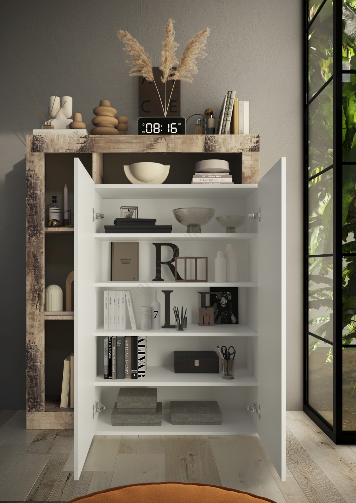 • Sellel on 4 avatud riiulit ja 5 sisemist sektsiooni kotide, kingade ja hooajaliste esemete hoiustamiseks.