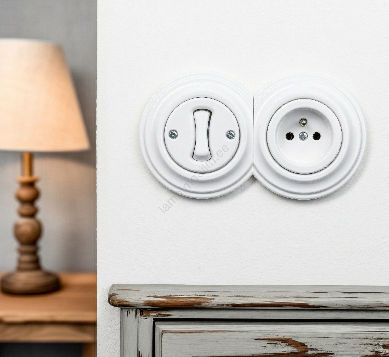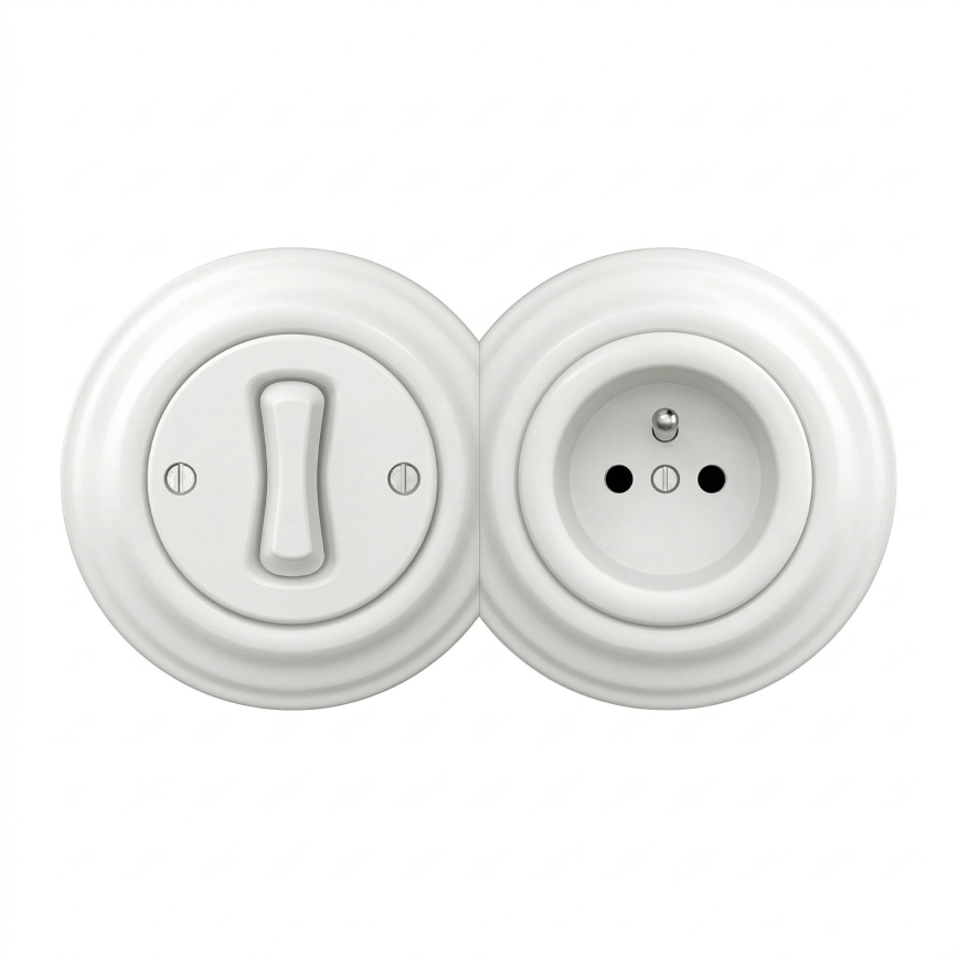 • Kliklap - Retro ühepoolne lüliti nr 1 ja 230 V pistikupesa raamiga, valge keraamiline