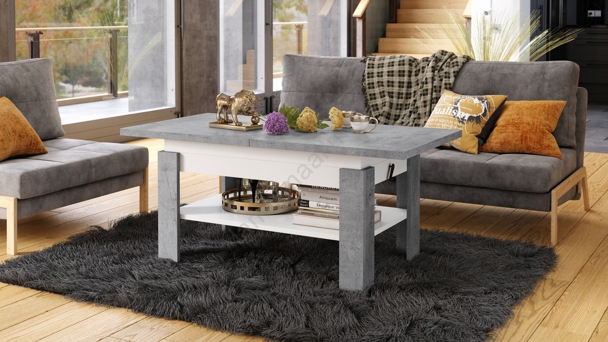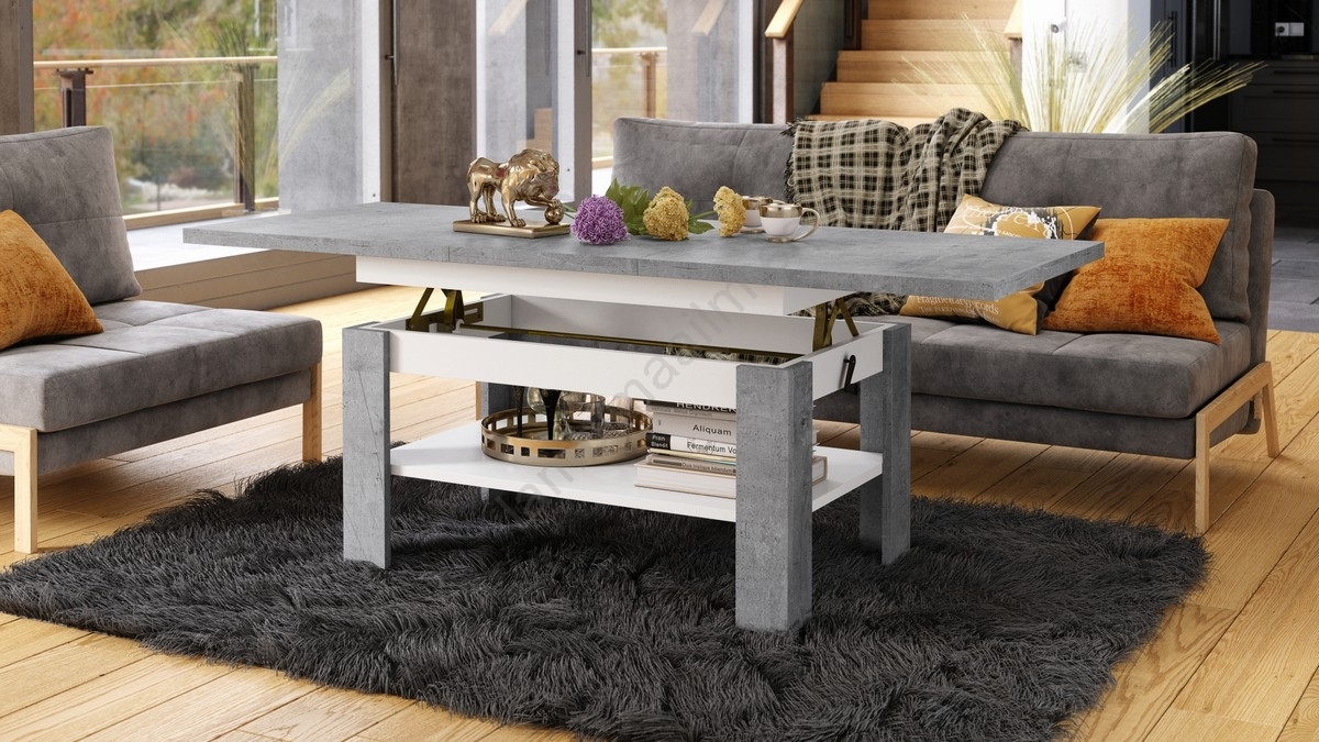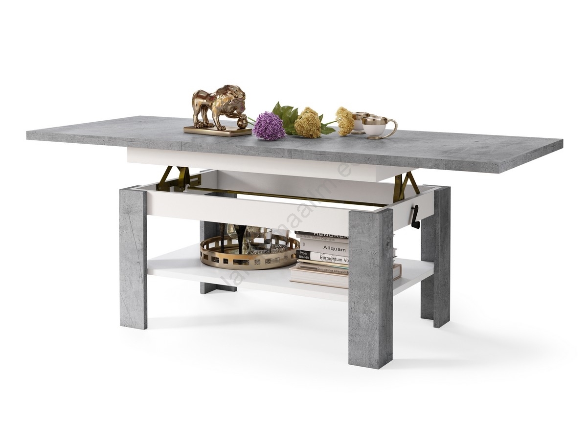 Laiendatav kohvilaud tõstetava lauaplaadiga ROY 130/170 × 65 cm, betoonhall/valge