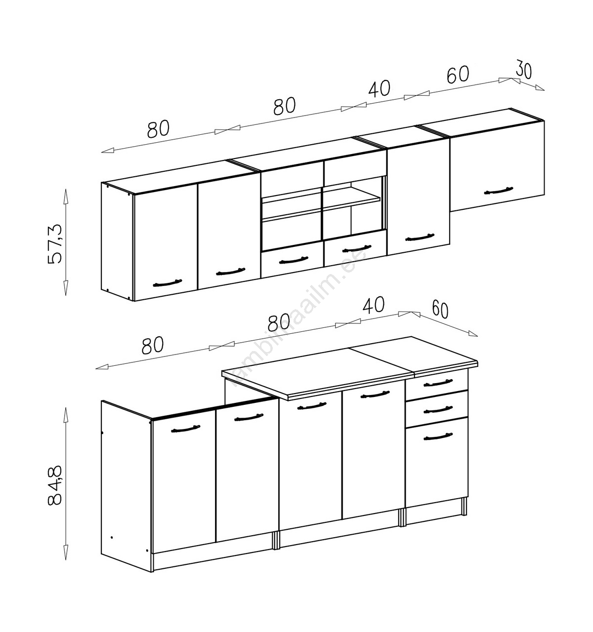 • Komplekt ei sisalda elektriseadmeid, köögivalamut ega köögikraani.