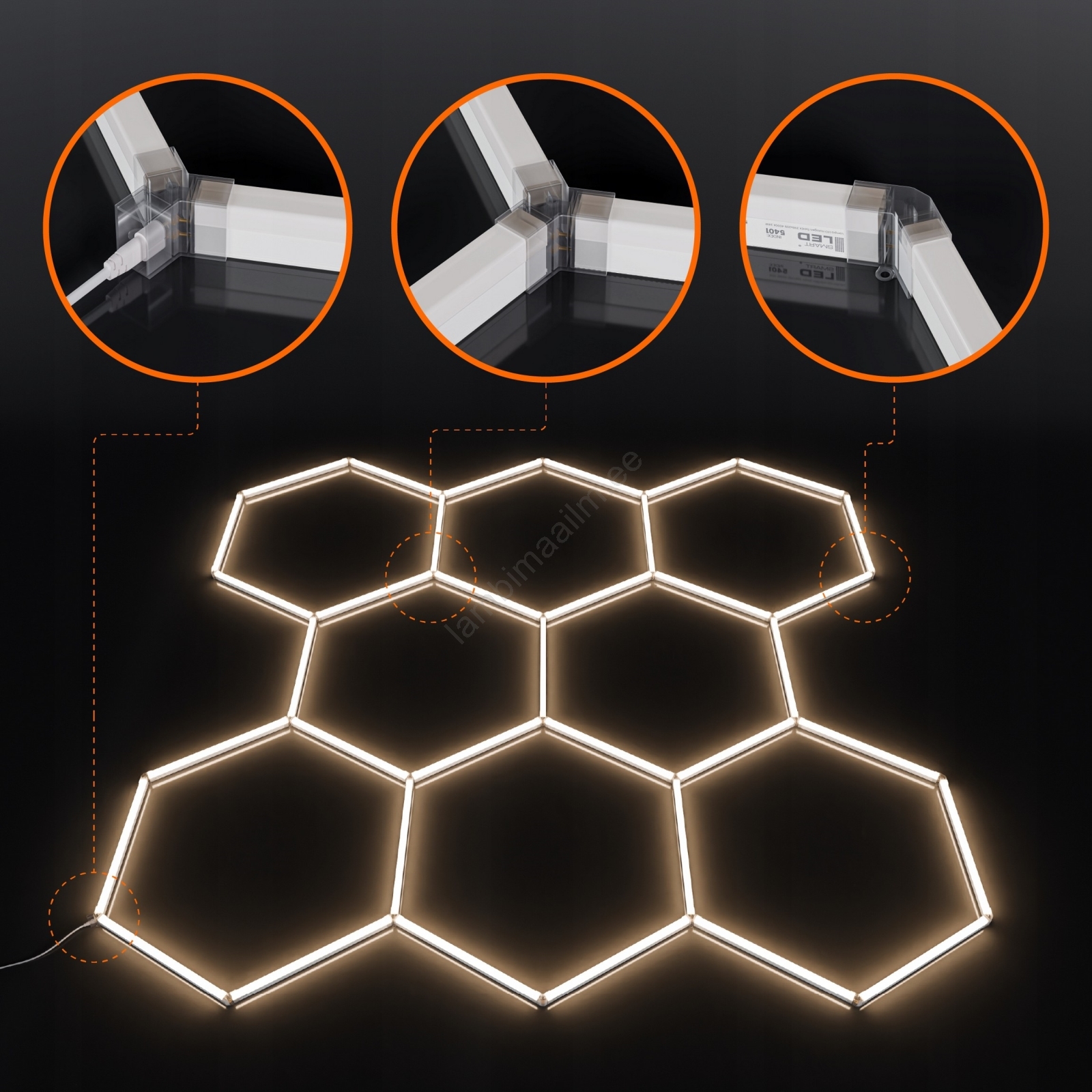 • Komplekt sisaldab: toitekaabel (150 cm), 35 LED-paneeli, 15 kolmekordset pistikut, 13 nurkühendust, 30 tüüblit + kruvisid, paigaldusvarustus (plastist silmused või metallkinnitused vastavalt valikule).