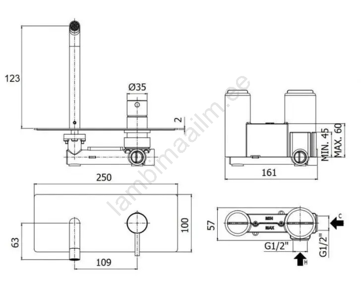 • Seina sisse paigaldatav valamusegisti kaasaegses disainis.