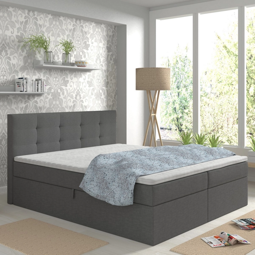 Polsterdatud voodi EMBER 180x200 cm antratsiit koos madratsitega, madratsitopperiga ja hoiuruumiga |