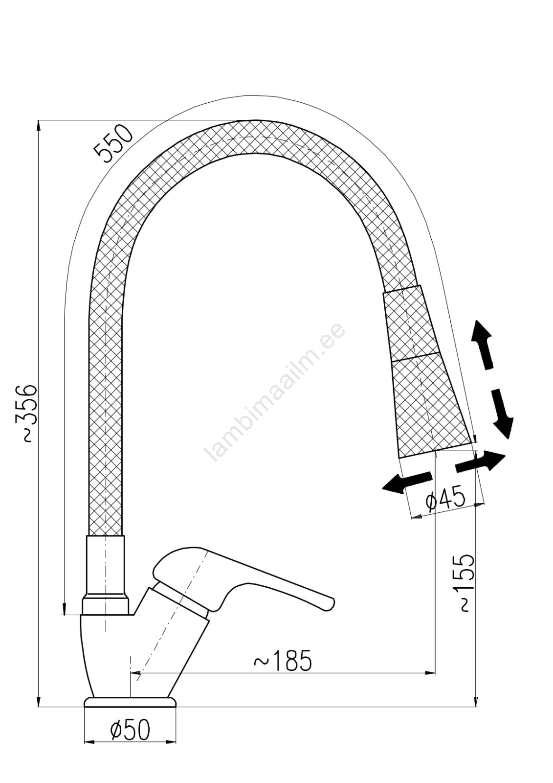 • Lauapealne valamusegisti painduva pöörleva vooliku ja pihustusotsikuga.
