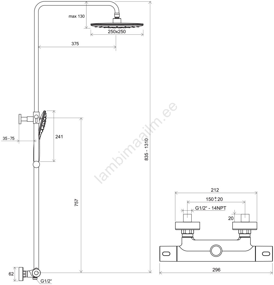 • Ülemine dušipea on ruudukujuline, valmistatud ABS-plastist, läbimõõduga 25 cm.