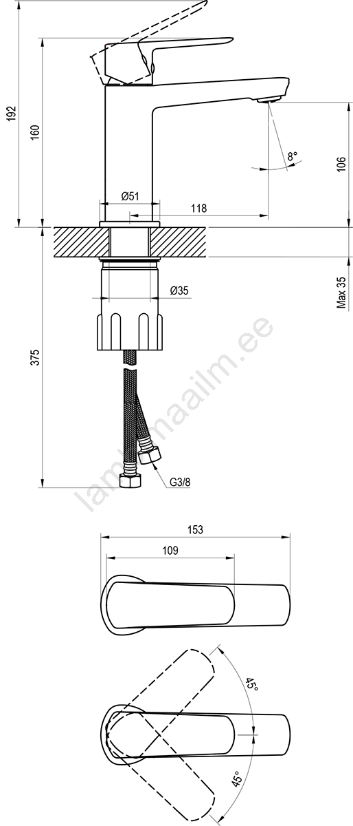 • Segisti tarnitakse ilma äravooluta ning sisaldab painduvaid ühendusvoolikuid pikkusega 450 mm ja läbimõõduga G3/8.