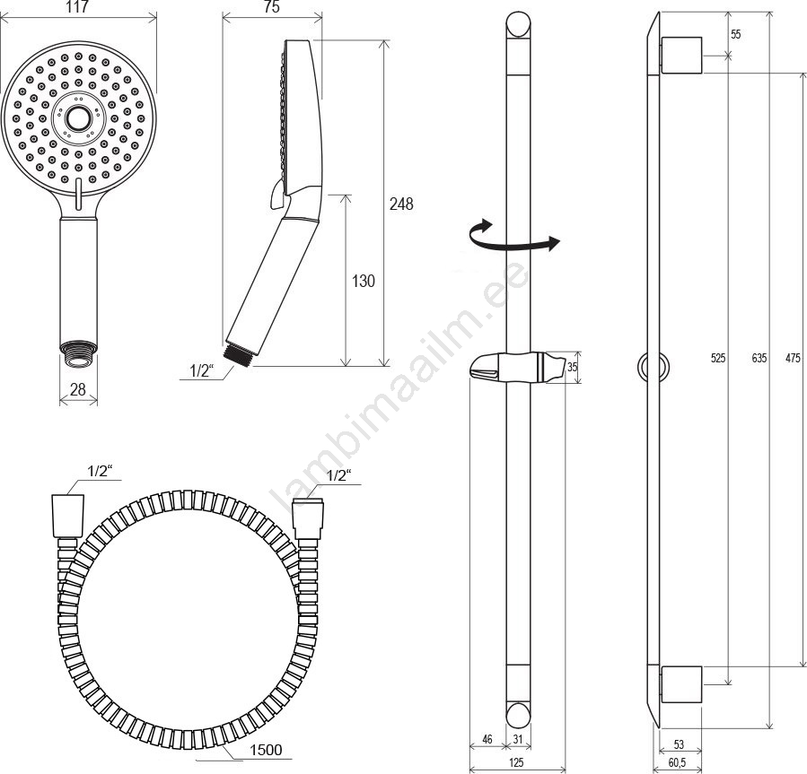 • Pööratav dušivarras liughoidikuga pikkusega 63,5 cm.