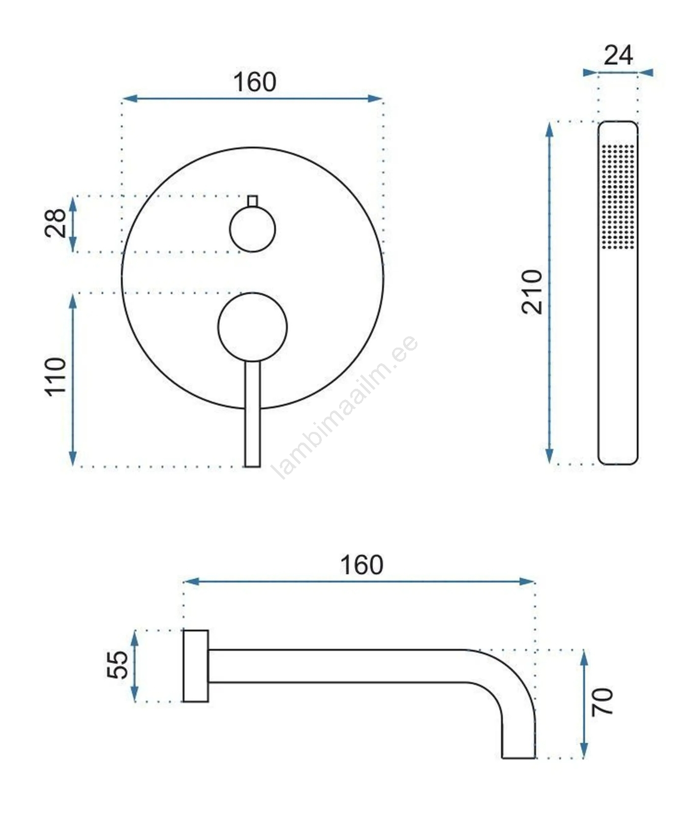 • Komplekt sisaldab: vannisegisti, seinale kinnitatav väljalase, käsidušš, dušivoolik (160 mm), käsidušši hoidik.