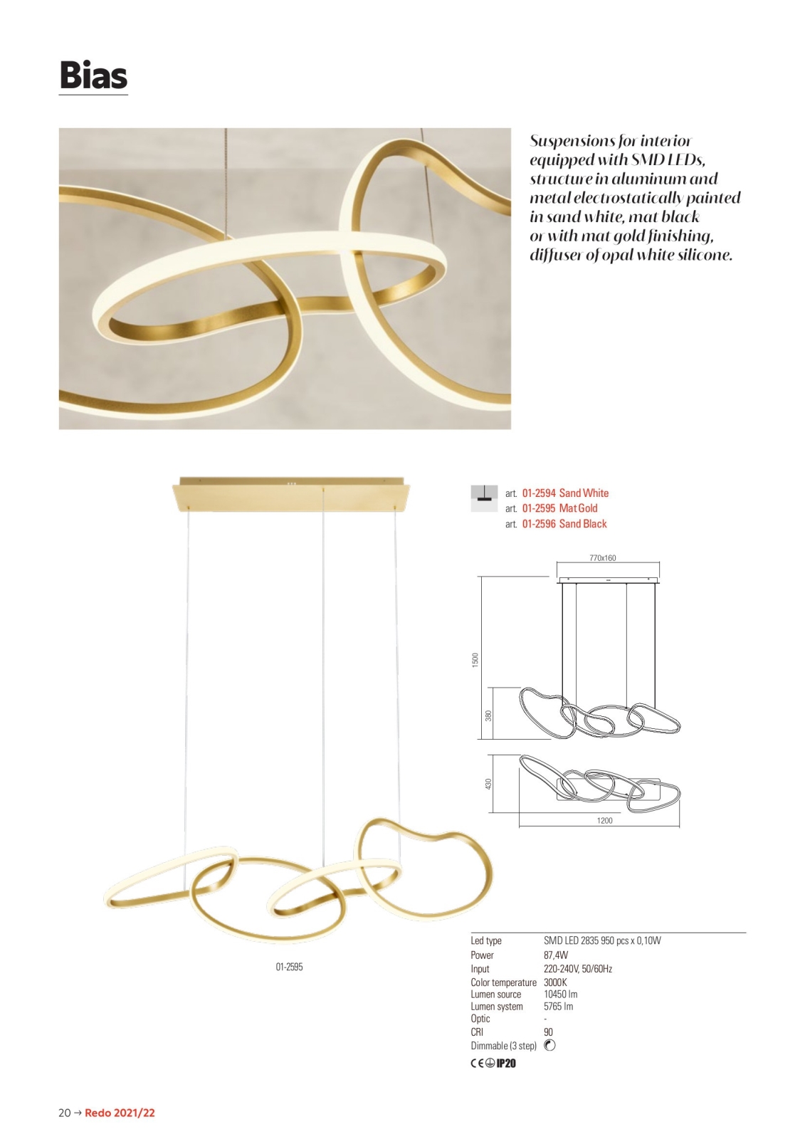 • Redo 01-2594 - Hämardatav lühter kaabliga BIAS LED/87,4W/230V 3000K CRI 90 valge