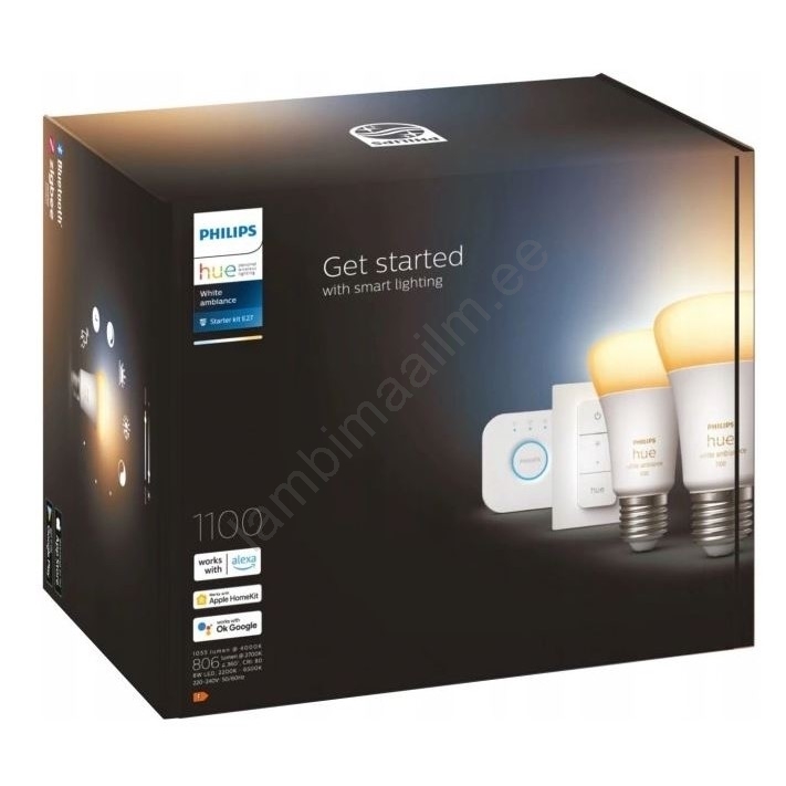 • Komplekt sisaldab ühendusseadet Hue Bridge, seinaklappi Dimmer Switch ja kahte White Ambience pirni.