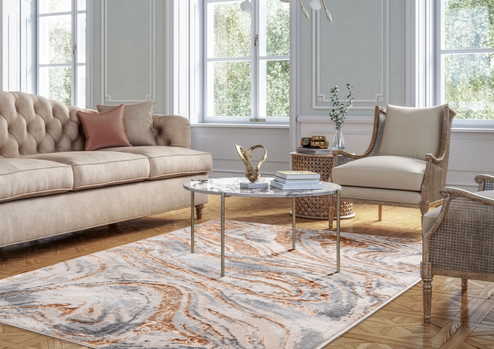 • Esteetiline ja moodne vaip peente abstraktsete mustritega.