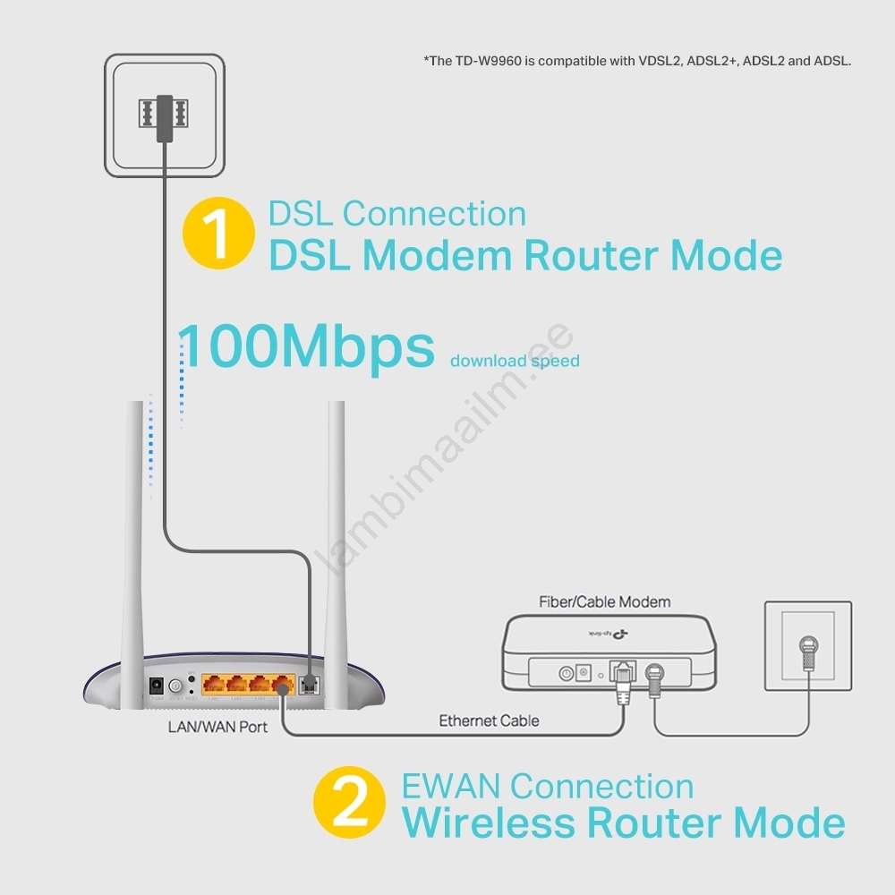 • Toode on kombineeritud modem ja traadita ruuter, mis võimaldab internetiühendust DSL-i (VDSL2/ADSL) või LAN/WAN-pordi kaudu.